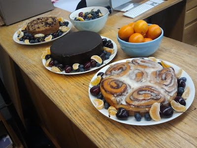 warm cinnamon rolls, chocolate ganache cake and cranberry orange coffee cake,