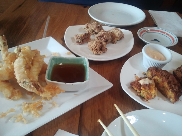 Shrimp tempura, sweet potato bacon croquettes, and chicken karaage