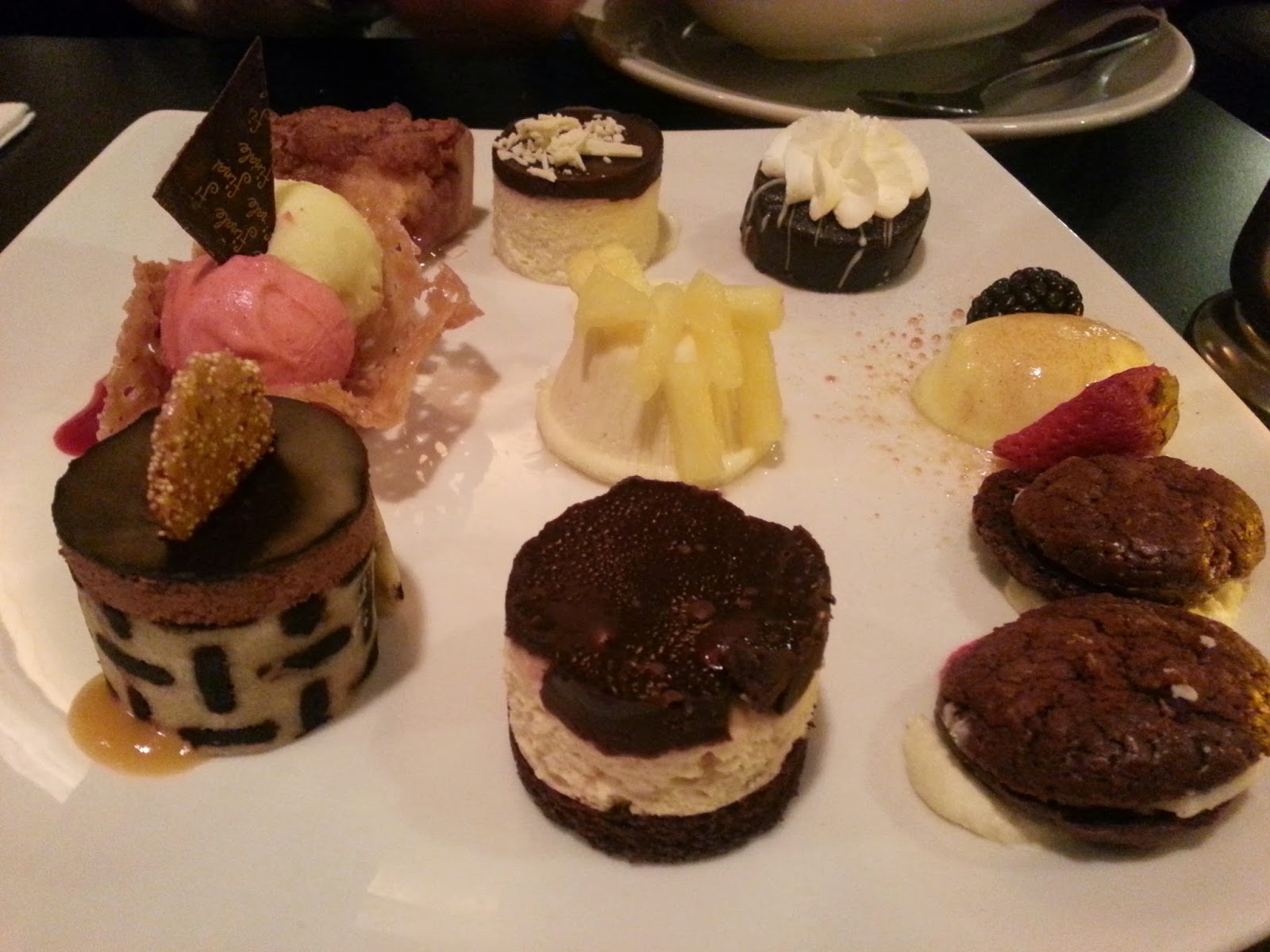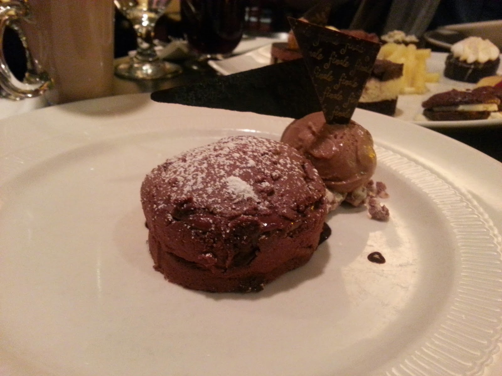 Then the sampler… beautiful little bits of Crème Brûlée, Manjari Mousse, Pineapple Cheesecake, Boston Cream, Whoopie Pies, Apple Cranberry Tart, Chocolate Ganache, Raspberry and Grapefruit Sorbet in an almond brittle basket, Peanut Butter Chocolate Pie with the added Molten Chocolate! It was beautiful and delicious! My hot chocolate was a revelation, with a smooth full-bodied chocolate milky start and a nutty finish!