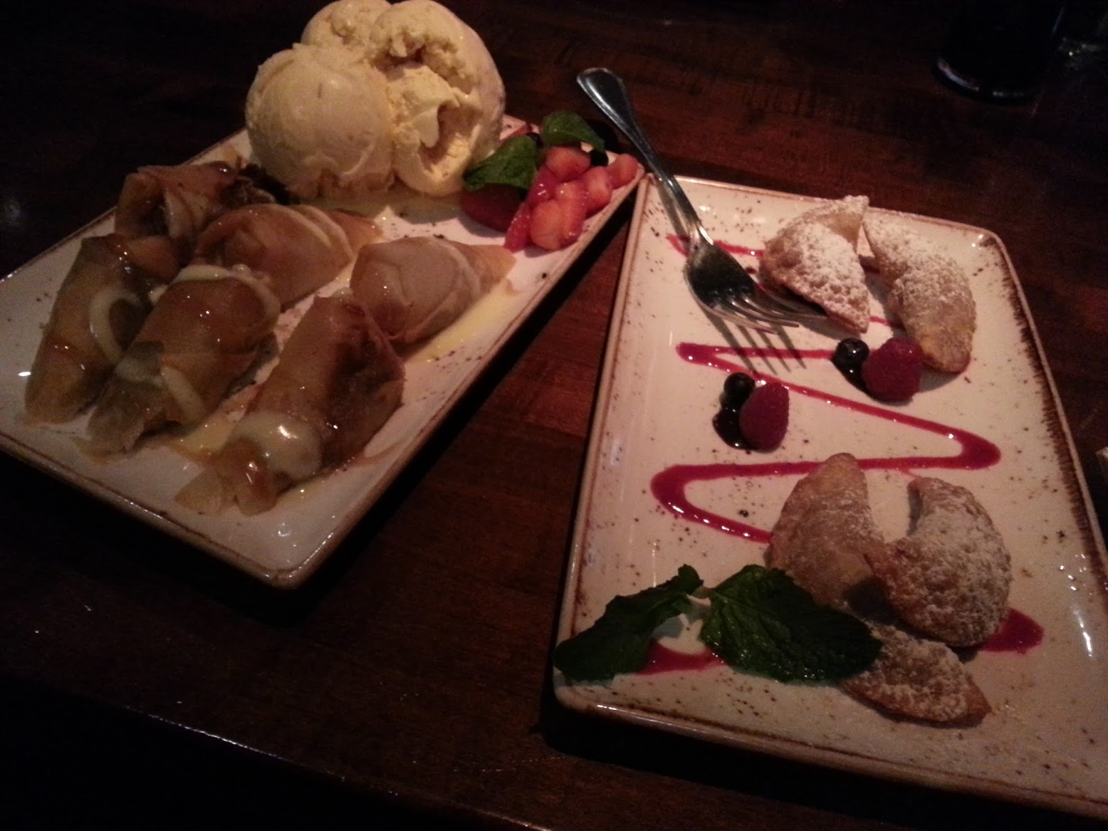 Desserts! BANANA SPRING ROLLS – Six warm, crispy bites of banana served with coconut-pineapple ice cream and drizzled with caramel and vanilla sauces and