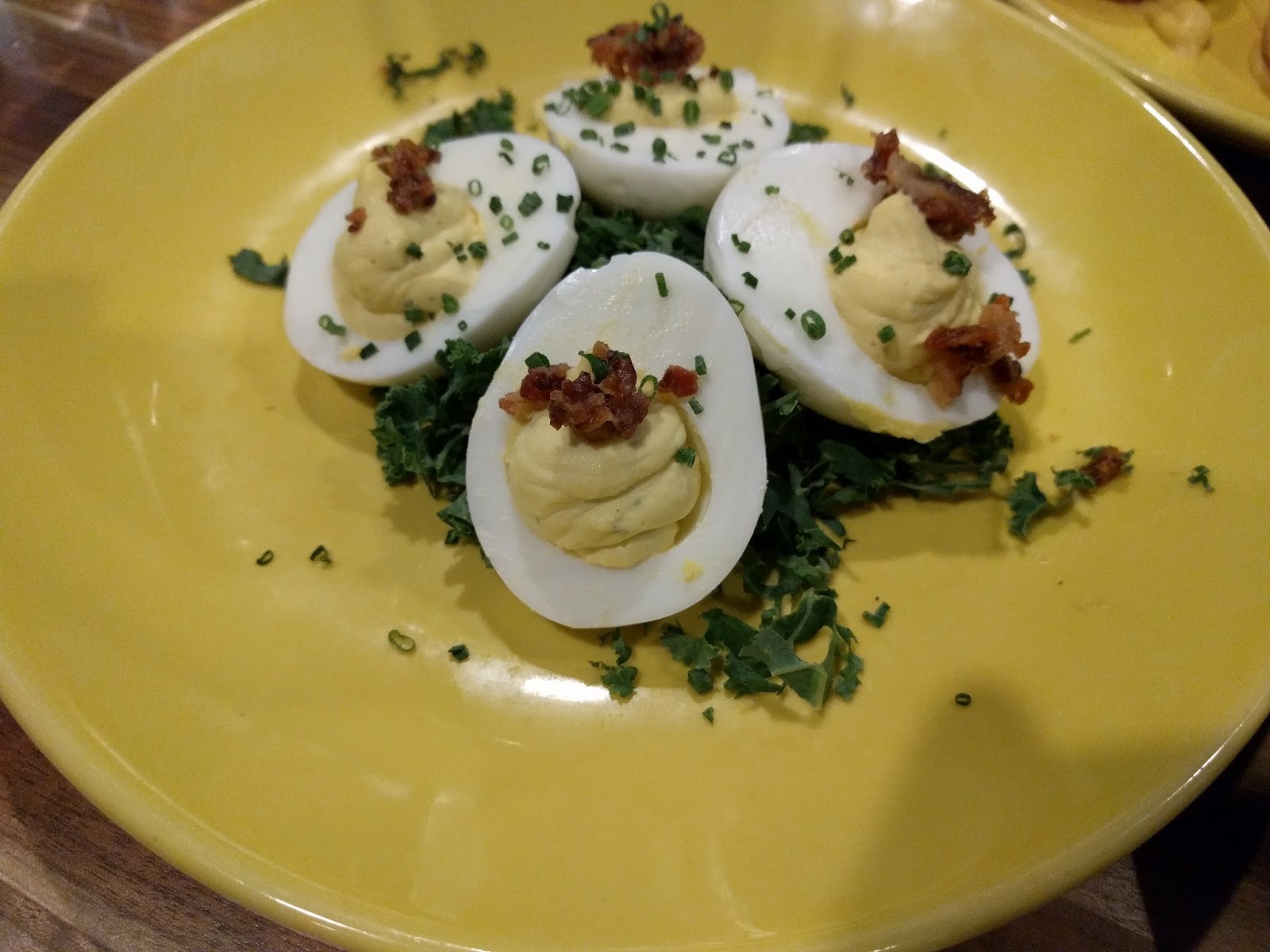 Deviled eggs with bacon & harissa